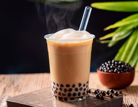 Steaming cups of Taiwanese Bubble Tea (boba milk tea) with tapioca pearls represent a globally popular and iconic beverage.