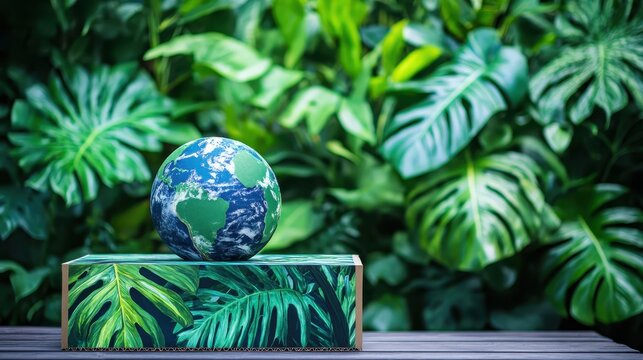 A recycled cardboard display box with abstract earth imagery stands against a lush green tropical foliage background