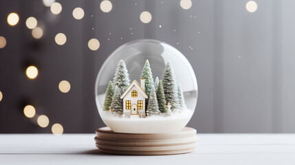 Christmas Glass snow globe with a fir tree forest and small house with lights. Bokeh Background. Symbol of winter decoration. Holiday season.