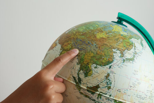 A boy's finger pointing China map on a white and green model earth globe ball.