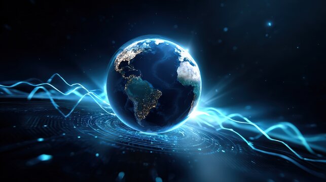 Glowing Earth Surrounded by Digital Light Waves in Space