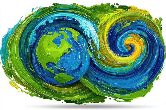 Two intertwined Earth globes, rendered in vibrant paint swirls of green, blue, and yellow