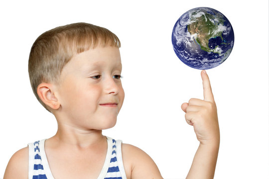 Boy turns the globe on finger
