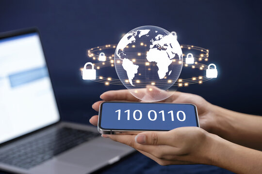 Digital security with abstract globe and binary code overlay