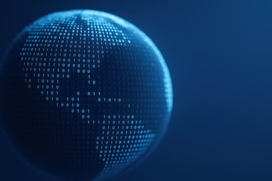 Digital Globe Binary Code Representation: Futuristic Global Network, Data Transfer, and Connectivity Concept on Dark Blue Background