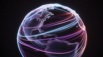 A vibrant digital globe with swirling neon lines representing global connectivity and technology advancement.