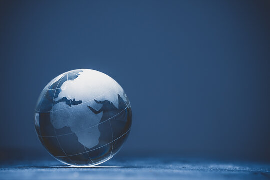 A glowing blue globe with interconnected lines and nodes representing a global network system