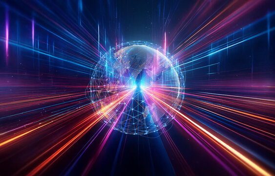 Futuristic globe with glowing lines and streaks, symbolizing technology and connectivity. Light trails rush towards the earth, representing data flow.