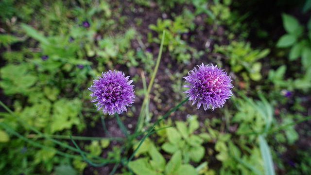 onion decorative with globulin mauve flowers against the green