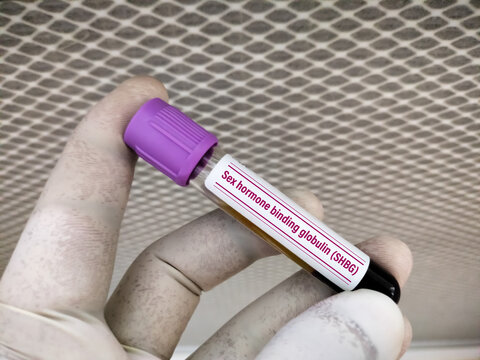 Test Tube with blood sample for sex hormone-binding globulin or SHBG test, diagnosis of abnormal testosterone level. A medical testing concept in the laboratory background.
