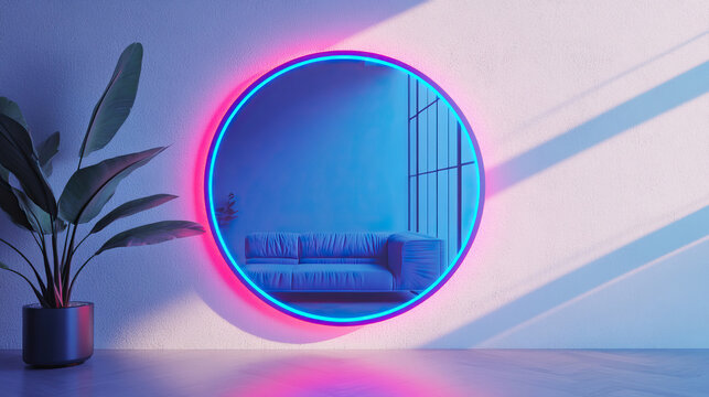 Glowing neon wave panel casting colorful reflections on glossy floor minimalist futuristic light art
