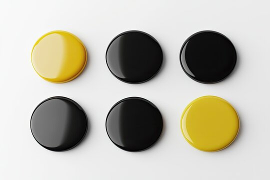 Six round, glossy buttons, alternating yellow and black