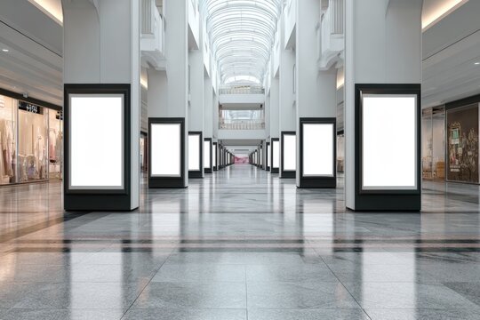 Empty shopping mall hallway with blank advertisement boards