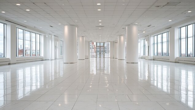 An endless hall of white columns reflecting light with lilac spheres resting on the floor, representing a futuristic, clean, minimalist and modern architectural scene.