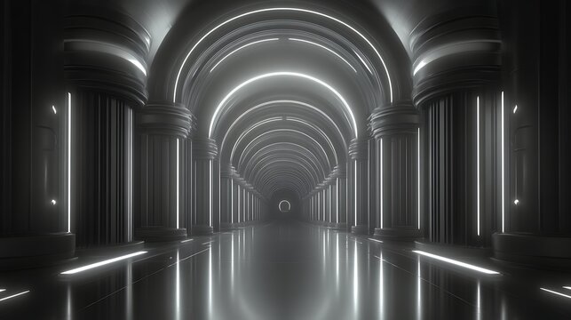 Futuristic Hallway With Archways and Columns Illuminated by Neon Lights