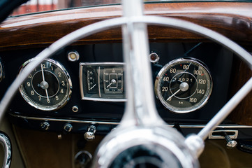 Fragment of metal steering wheel and dashboard of old classical automobile