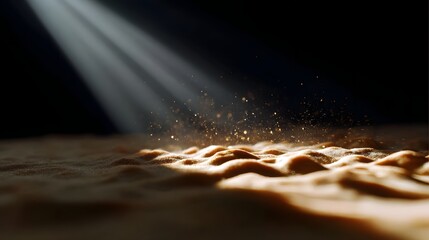 Mesmerizing sand dunes glistening with warm, golden sunlight beams casting ethereal shadows across the granular, textured landscape