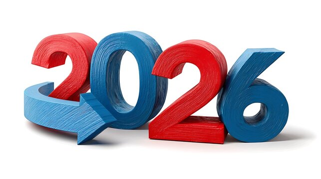 3D 2026 design with red and blue glossy numerals and patriotic ribbon American theme