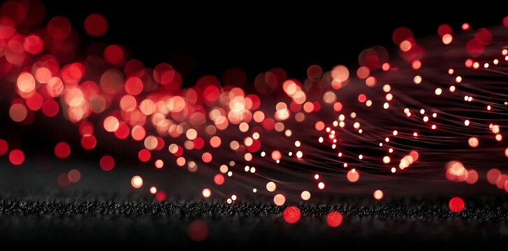 Fiery light ribbon with spark particles on red gradient, abstract neon wave