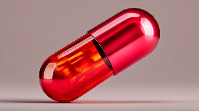 Glossy red capsule pill with seam placed on white surface against light gray background