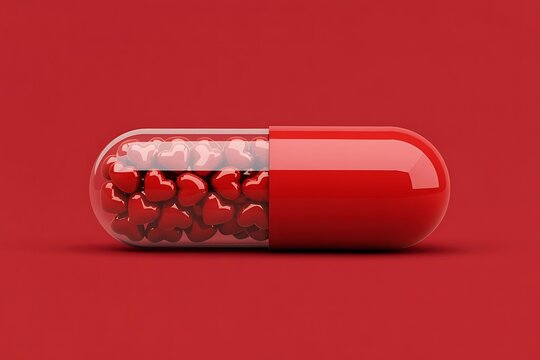 A glossy red capsule bottle stands prominently against a matching red background, creating a striking visual that captures attention and conveys vitality and health.