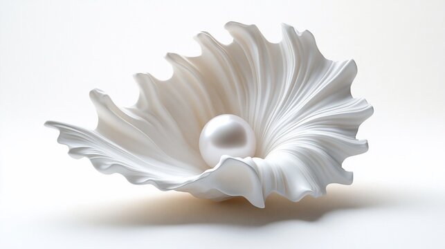 A single, perfectly round pearl rests inside a white seashell with a ruffled, organic texture. The pearl is smooth and glossy, and the shell has a delicate, almost translucent quality.