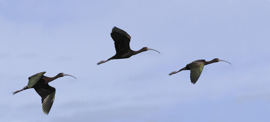 Three Glossy Ibises flying in the sky