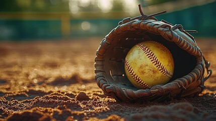 A baseball rests in a worn leather glove on a dusty diamond, stadium blurred background