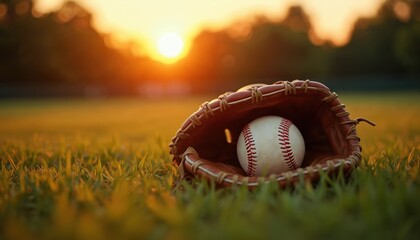 Baseball glove rests on grassy field near ball. Golden sunset casts warm light over sports equipment. Evening game awaits on quiet baseball diamond. Outdoor recreation scene.