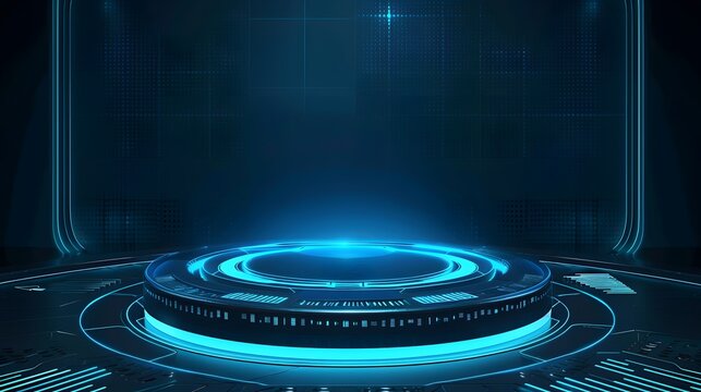 Vector illustrations of Futuristic digital technology stage with glowing blue pedestal podium stage layout for hi tech showcase.Digital tech concept.