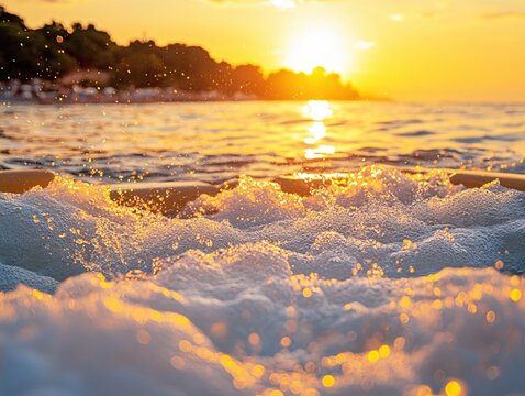 Golden sunset light over sea waves splashing with bokeh effect on a summer evening