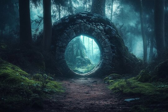 A mystical portal glows in a fantastical landscape, an ancient stargate with ornate details and bright light beckoning discovery.