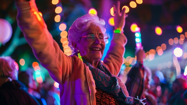 Senior woman smiling and holding a glow stick high in the air while dancing with friends at an outdoor concert