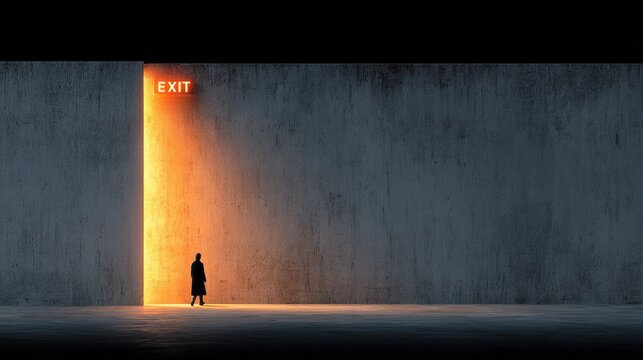 A solitary figure stands before a massive dark concrete wall with a bright orange-yellow light shining through,