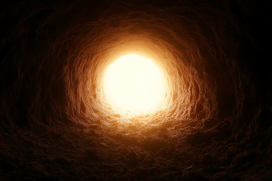 A mysterious tunnel with a bright light at the end, beckoning towards the unknown. The cave's rough texture contrasts with the light's smooth glow.