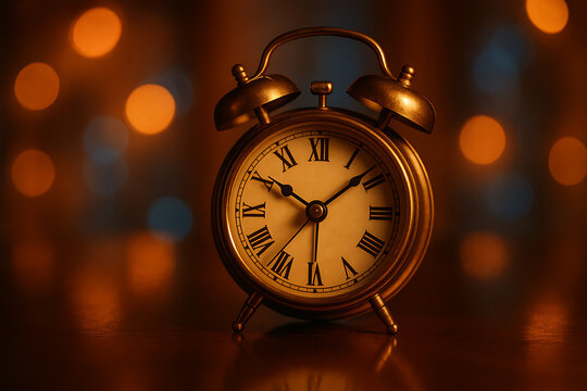 Vintage clock face with metal hands illuminated in warm light