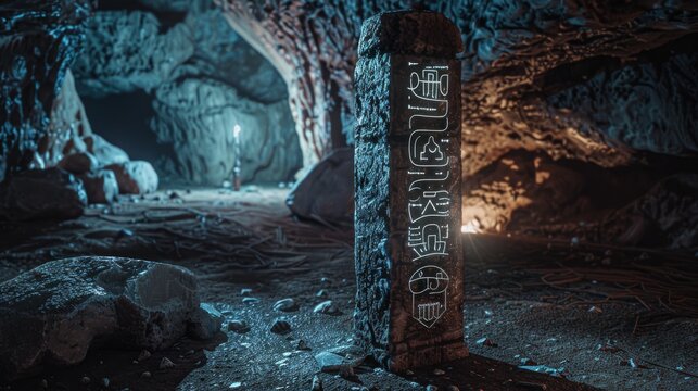 A mystical cave featuring a standing monolith with glowing ancient symbols engraved, surrounded by a dimly-lit, rugged environment.