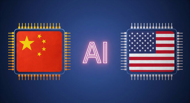 Flat design style with two large AI microchip icons, China flag on left chip, USA flag on right chip, glowing AI text in center, tech theme JPG
