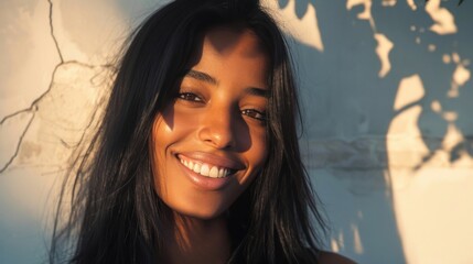 Smiling woman with long dark hair standing in front of a white wall with shadows of leaves exuding a warm and inviting aura.