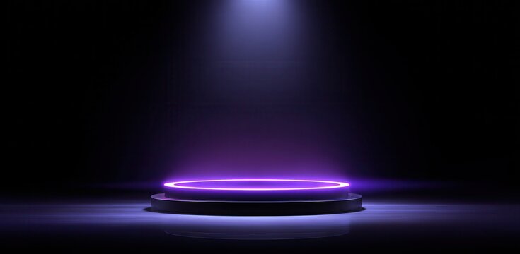 A glowing purple halo floating above an empty podestal, set against a dark background with subtle light effects for depth and focus on the product display area. Vector illustration.