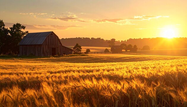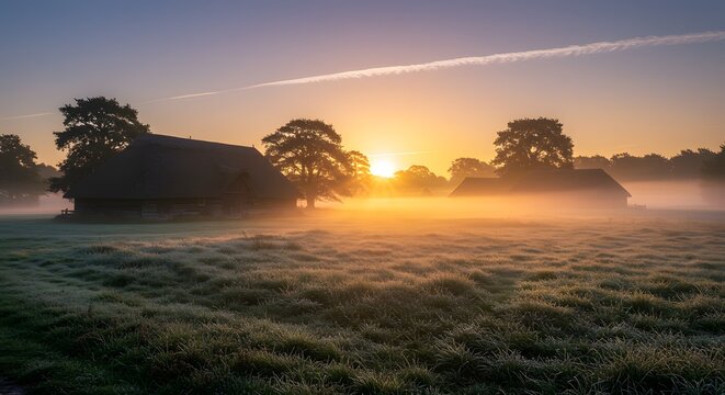 Beautiful rustic barnyard at sunrise, featuring a glowing golden sunrise illuminating the rustic wooden barns and casting long shadows across the misty, dewy grass