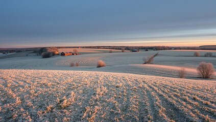 Glittering frost-covered field showing parallel stubble and furrows at rural farm, barns glowing