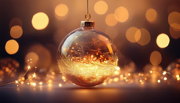 glowing glass bauble amidst warm twinkling fairy lights on soft background