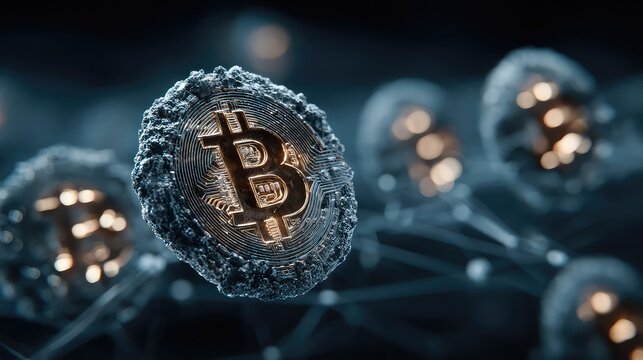 Animated bitcoin symbol and network connections over a dark background. Digital currency and blockchain technology concept for financial news or investment analysis.