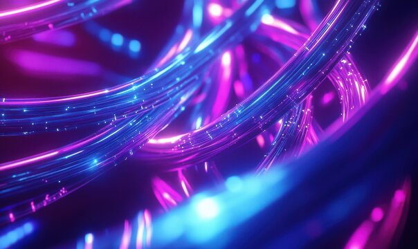 Vibrant glowing fiber optic cables in shades of purple and blue, soft diffused lighting enhancing the dynamic high-tech effect,