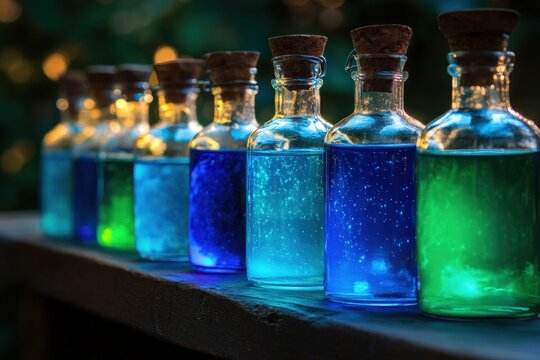 Magical potion bottles with glowing liquid, showcasing vibrant colors and cosmic elements. Each bottle contains unique, enchanting essence that sparks curiosity and wonder