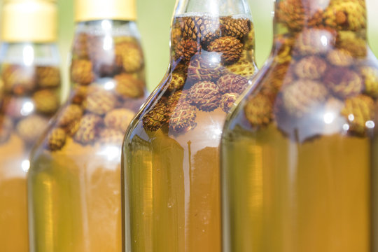 Detail of bottles of grappa, a typical liquor, San Romerio Alp, Brusio, Canton of Graubunden, Poschiavo Valley