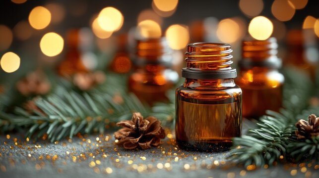 Amber glass bottles of essential oil with fir branches and pine cones