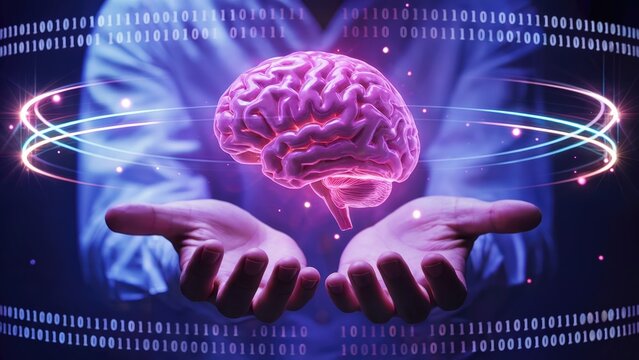 Futuristic digital brain with glowing neural pathways processing binary data streams
