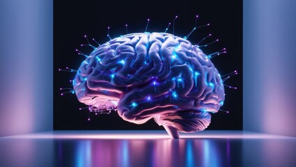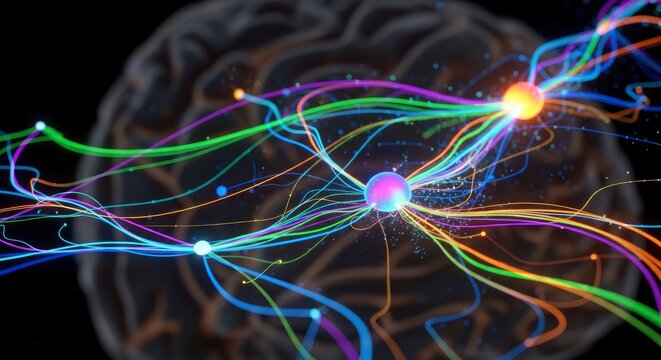 A translucent brain model with vibrant glowing neural pathways and luminous spherical connections set against a dark background